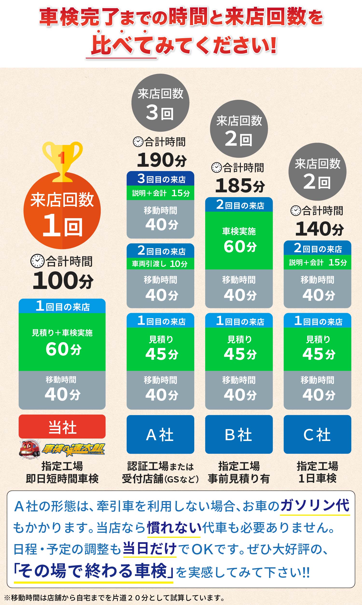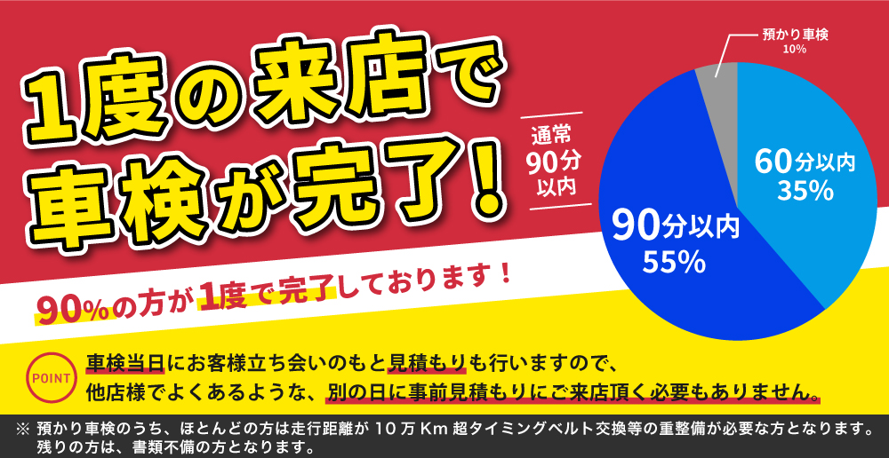 ※整備内容によっては、車検が60分で完了しない場合もございますので、予めご了承くださいませ。
